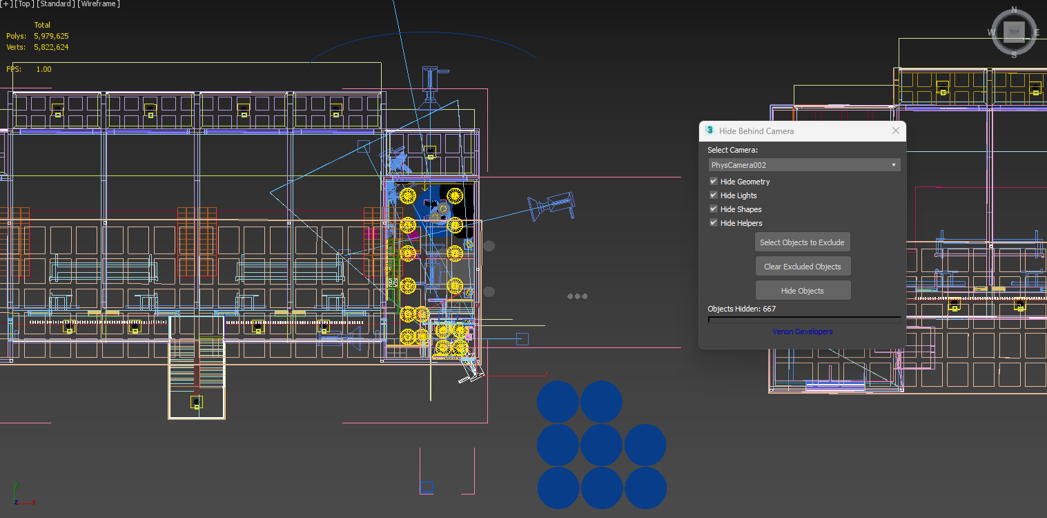 Hide Behind Camera is a utility script for Autodesk 3ds Max that allows you to quickly hide objects that are entirely behind the selected camera or within its near clipping distance. This is especially useful for optimizing your scenes, cleaning up clutter, or improving rendering performance.