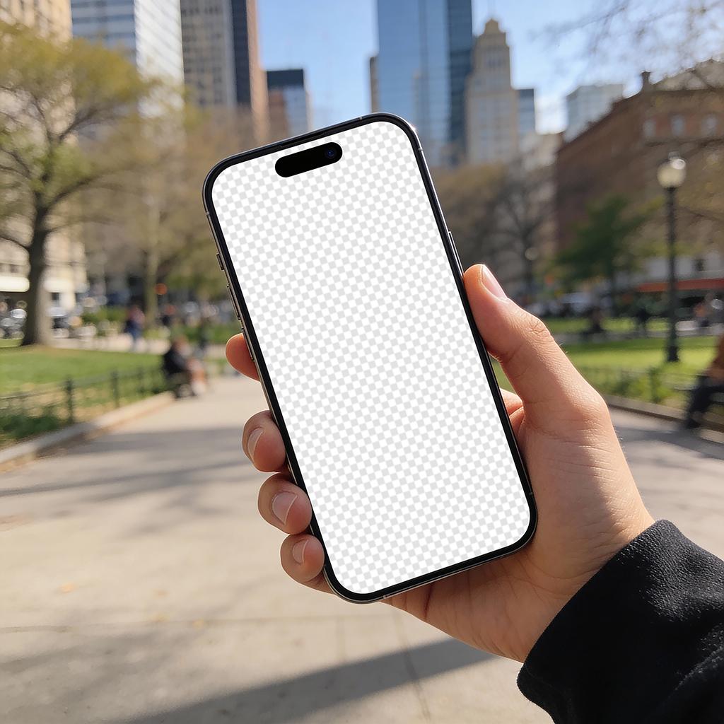 This high-resolution 4K PSD mockup file features a hand confidently holding an iPhone Pro (with titanium frame and Dynamic Island) in a vibrant city street setting during golden-hour sunset, with blurred tall buildings, traffic lights, bokeh effects, and warm sunlight creating a dynamic, modern urban lifestyle atmosphere that emphasizes mobility and real-world usage.