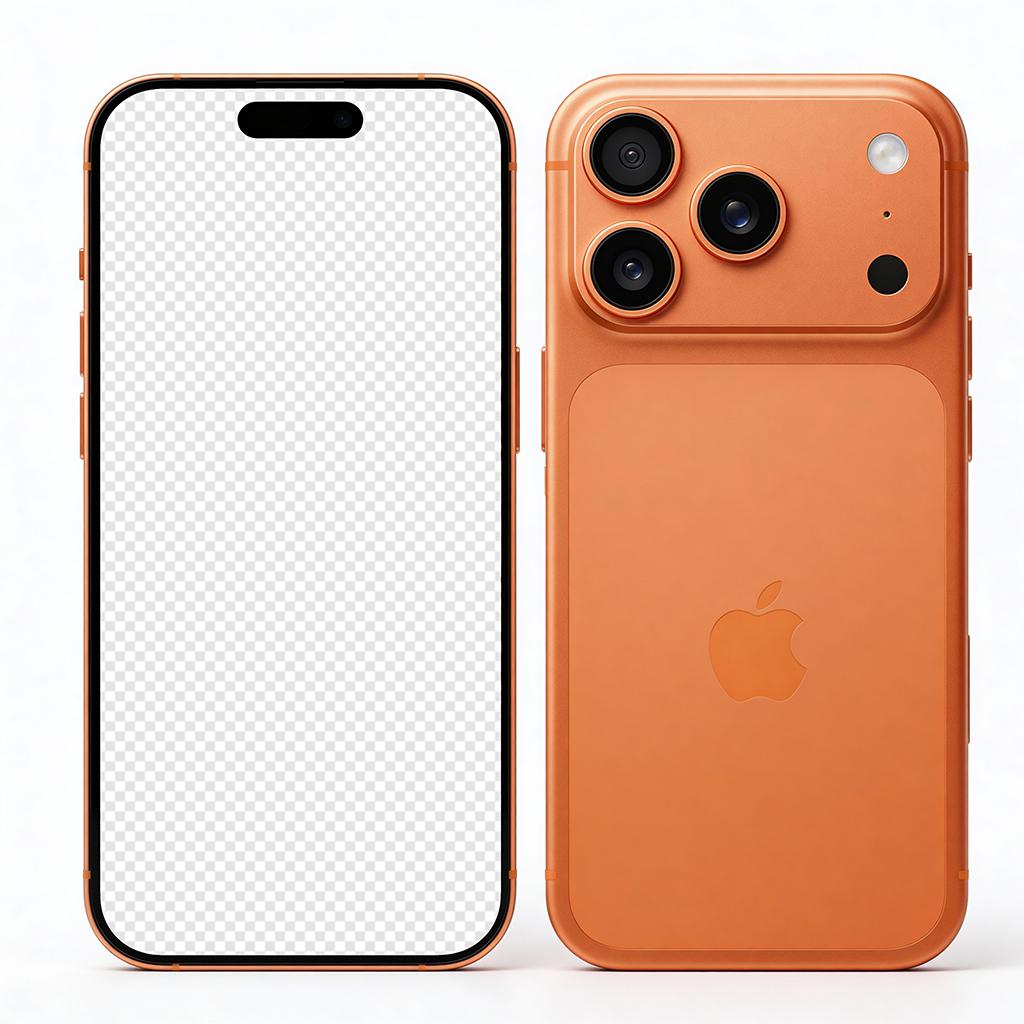 This high-resolution 4K PSD mockup file showcases a premium clay-style render of the iPhone 17 Pro Max in a sophisticated cosmic orange finish, presented in dual views—front with Dynamic Island and large display, and rear highlighting the triple camera system and centered Apple logo—against a clean white background for a sleek, modern, and professional product visualization.